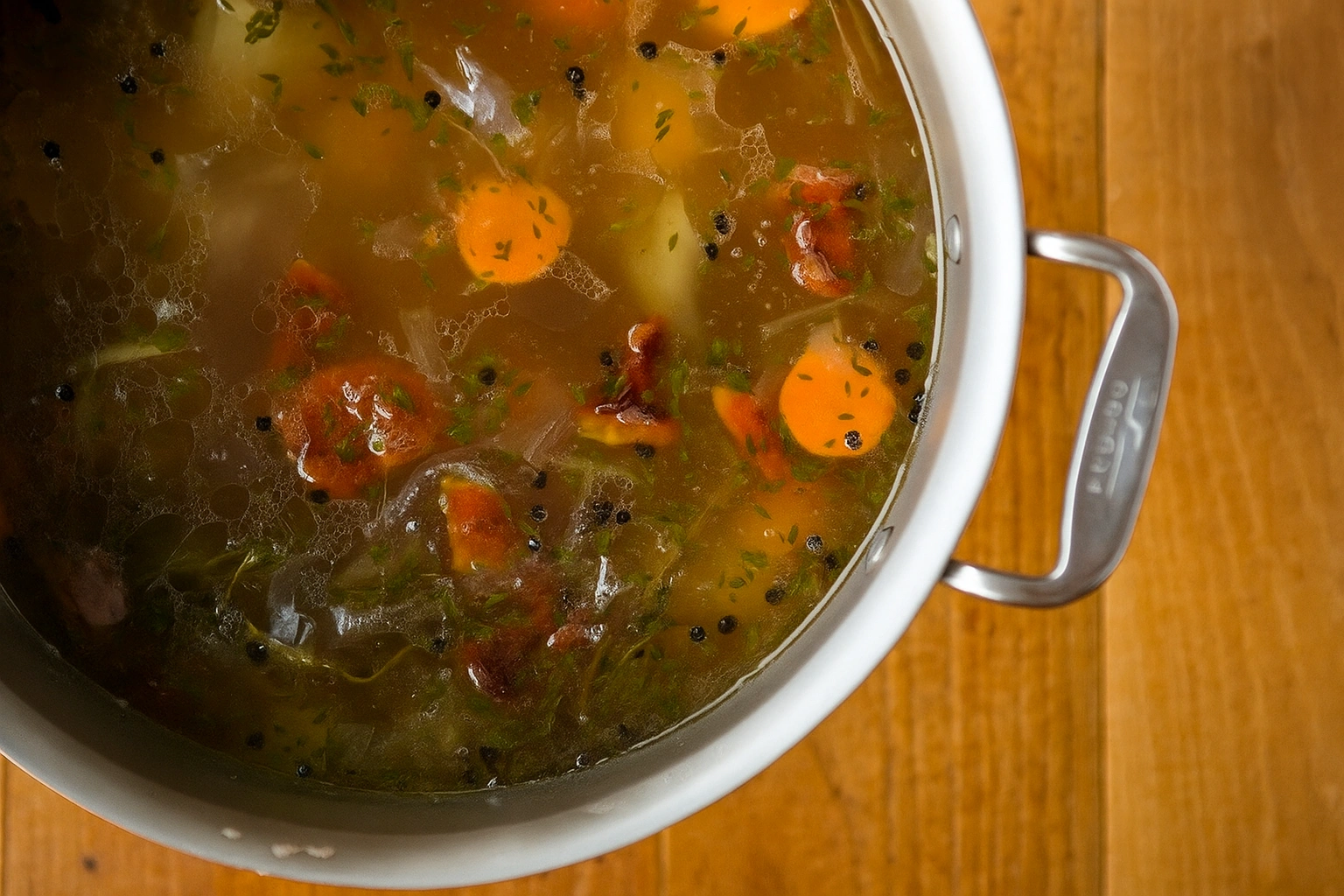 - یک پیاز نصفشده، چند ساقه کرفس، یک هویج خردشده، چند حبه سیر، کمی فلفل سیاه، یک برگ بو و در صورت تمایل یک چوب دارچین به قابلمه اضافه کنید. نصف استکان سرکه هم بریزید تا کلسیم و مواد معدنی راحتتر از استخوان جدا شوند.