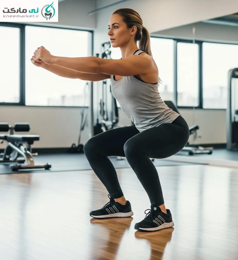 - اسکات نیمه (Half Squat): خم شدن زانو تا زاویه حداکثر ۴۵ درجه، ۱۰ تا ۱۲ تکرار.