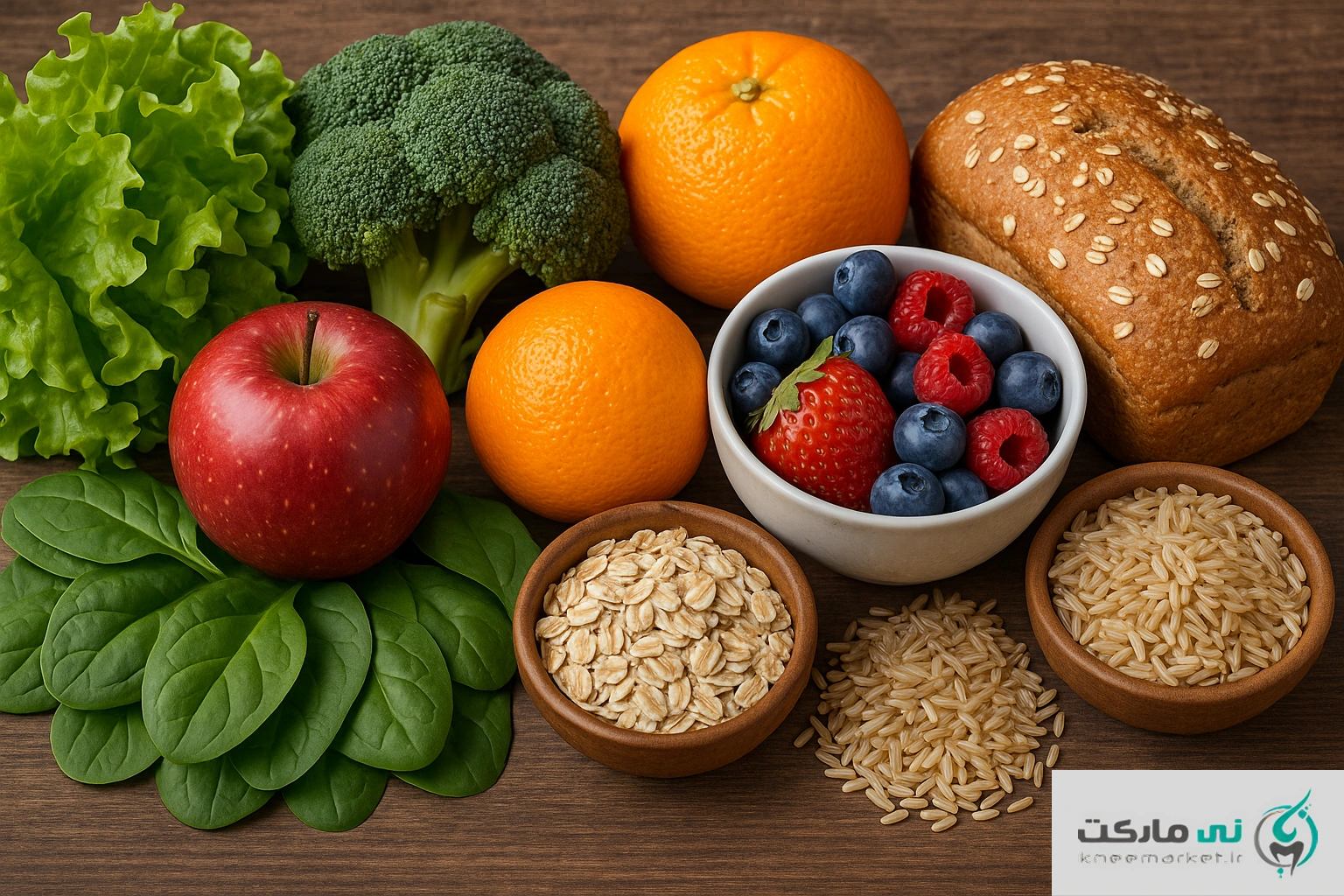 - میوههای کمکالری (سیب، پرتقال، انواع توتها) ← فیبر و آنتیاکسیدانها