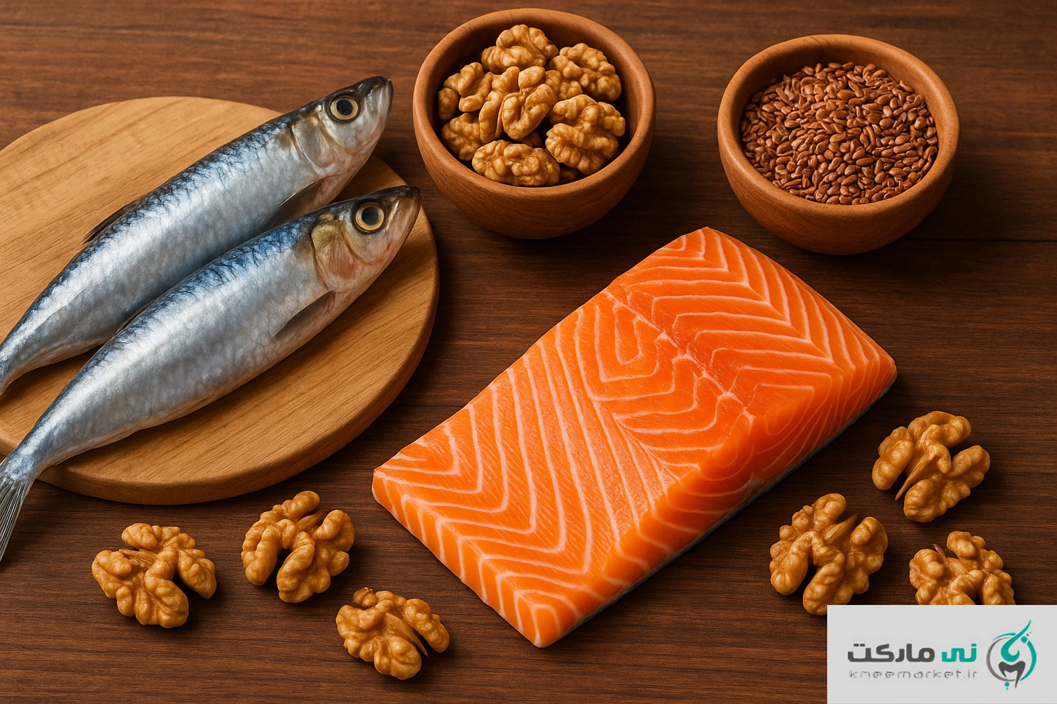 - ماهیهای چرب (مثل سالمون، ساردین) ← سرشار از امگا ۳