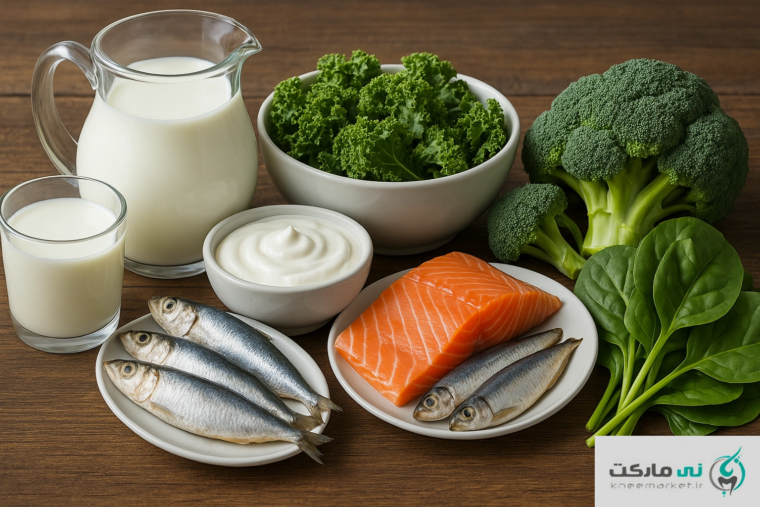 - سبزیجات برگ سبز (کلم، اسفناج، بروکلی) ← ویتامین K و کلسیم گیاهی